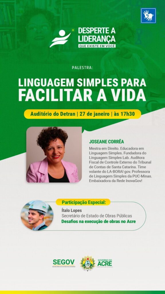 No dia 27 de janeiro (terça-feira), às 17h30, acontece no Auditório do DETRAN/AC a palestra “Linguagem simples para facilitar a vida”, promovida pela SEGOV.